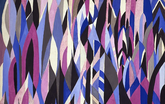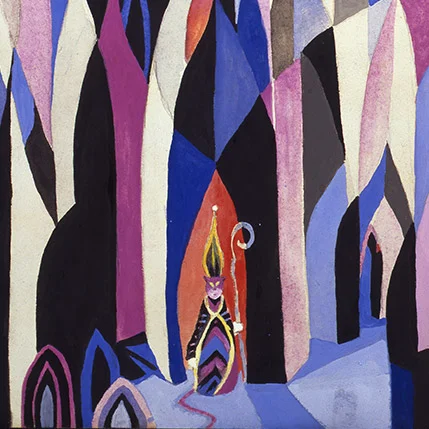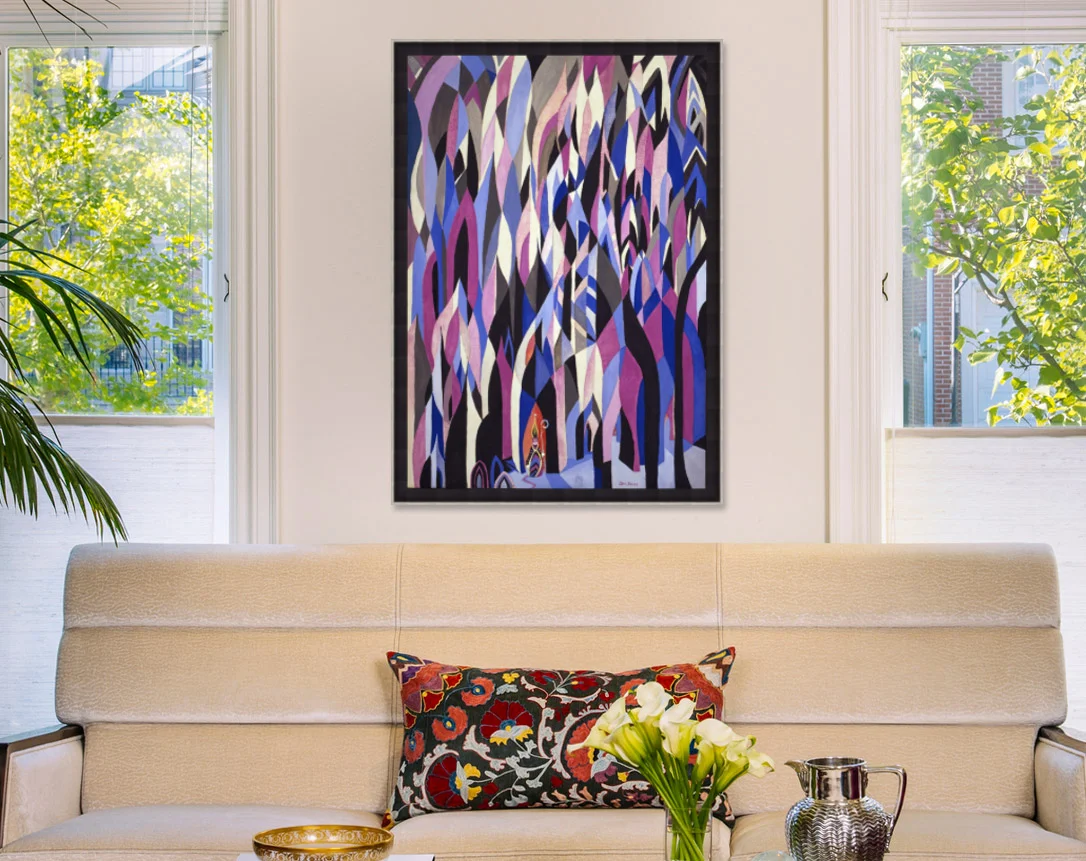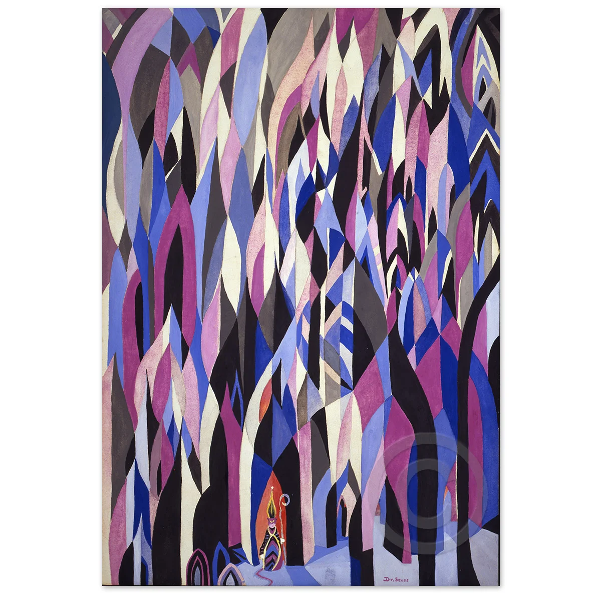 Ted seems to have transformed Wayfarers’ prism of windows, triangles, and redwoods into a stunning tapestry of geometric colors stretching beyond the edges of the canvas for Archbishop Katz in His Cathedral. In February 1984, the nationally syndicated columnist Herb Kupferberg wrote about seeing this artwork at Seuss House and, without knowing Ted’s influences, likened this artwork to a “huge forest of lavender and blue prisms.”