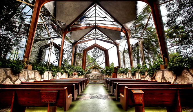 It was also the environs of Villa Narcissa that likely provided the visual inspiration behind Archbishop Katz in His Cathedral. Lloyd Wright, son of Frank Lloyd Wright, was commissioned to build "Wayfarers Chapel" on a parcel of land next to Villa Narcissa. This now-famous glass chapel was constructed with a myriad of geometric forms, creating a prism of architectual and natural elements intended to symbolize spiritual values and creatively pay homage to California’s majestic redwood trees. The cathedral-like presence of the surrounding redwoods formed the living walls and roof for the structure.