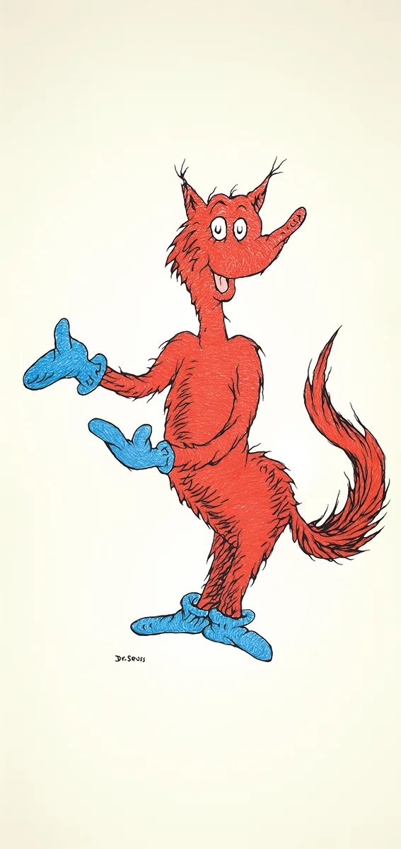 From Random House’s “I Can Read It All By Myself Beginner Books Series,” Ted’s story features two main characters, an anthropomorphic “Fox” and “Knox,” who speak almost entirely in densely rhyming tongue-twisters. After introducing Fox and Knox, as well as props, box and socks, Dr. Seuss takes these four rhyming items through several permutations, adding more items as he goes along. This prompts Knox to complain every so often about the difficulty of the tongue-twisters.