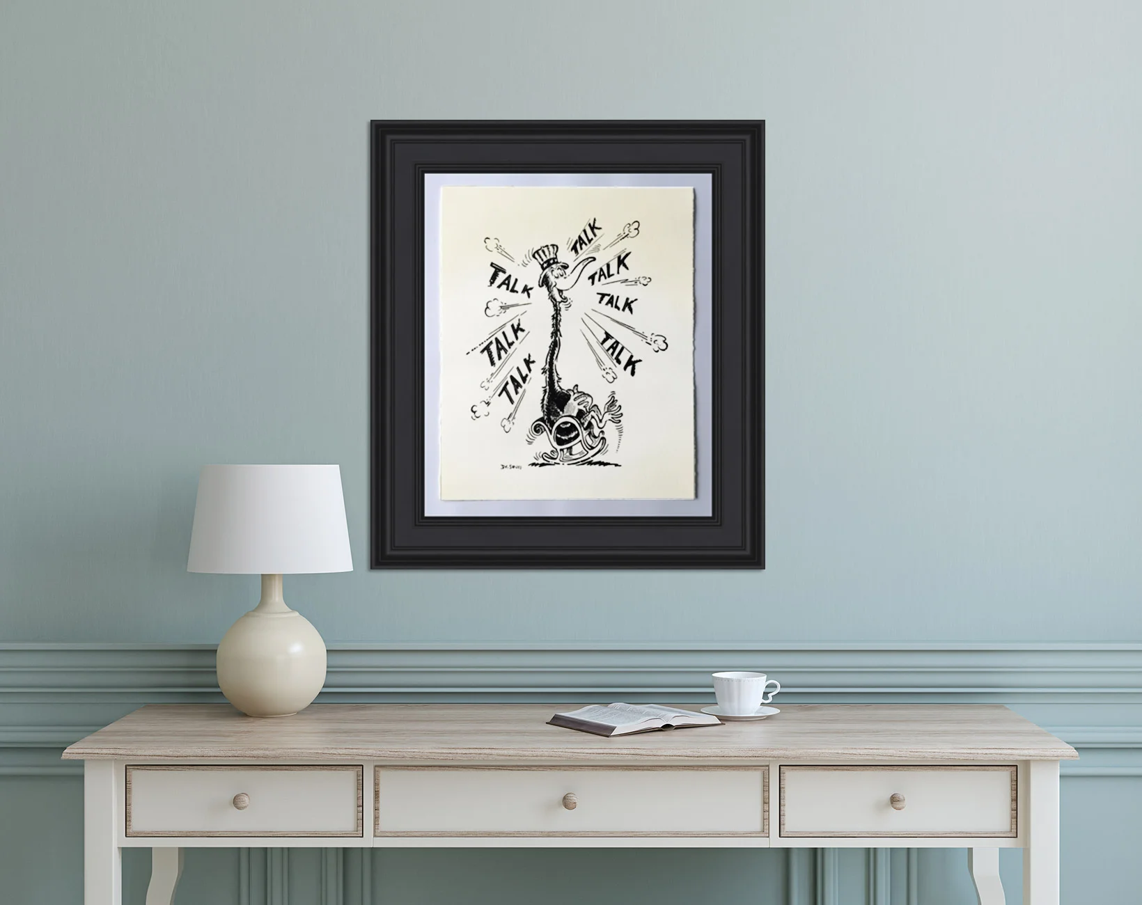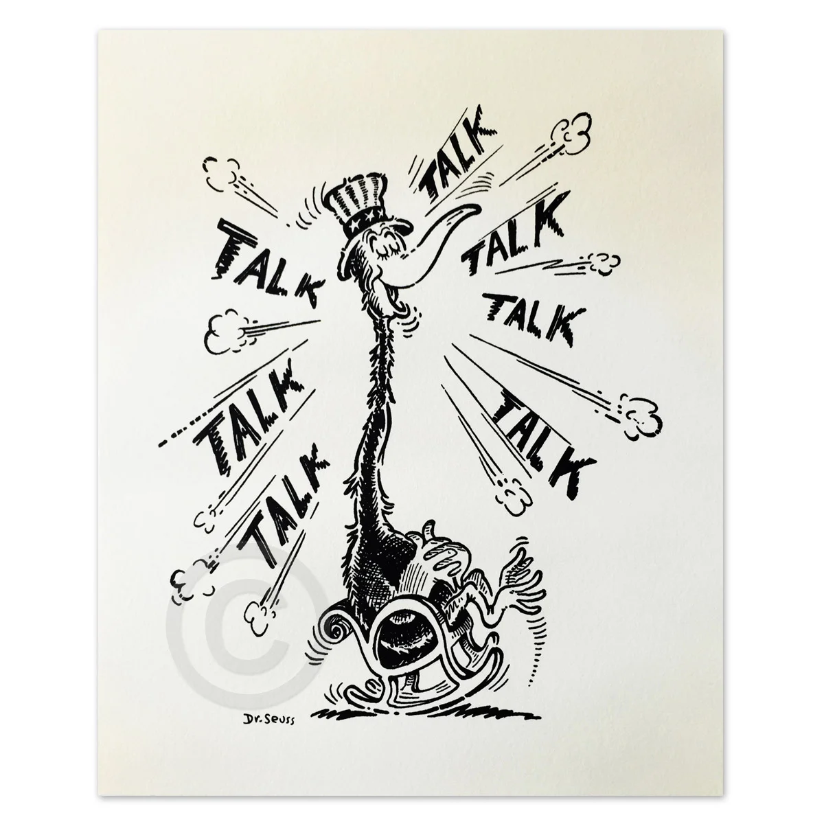 Many have delighted in the idea of what Dr. Seuss might deliver if he were to apply his sociopolitical humor to today’s politics. Look no further than Talk Talk Talk, an artwork Dr. Seuss could seemingly have created specifically for this modern-day presidential campaign.