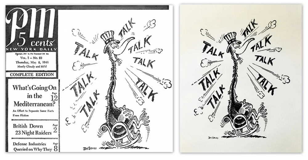 Dr. Seuss’s 1941 artwork, Talk Talk Talk, presents one of the quintessential examples of his enduring relevancy. Throughout the career of Theodor Seuss Geisel (aka Dr. Seuss), Ted grasped a seemingly prophetic quality that makes his themes as pertinent today as when they were first created. Originally featured on the cover of PM’s May 8, 1941 edition, this powerful World War II editorial cartoon instinctively sums up the current mood of our country during this highly charged 2016 election season. The enduring chasm between political “talk” and “action” is the persevering component that makes this artwork as significant today as it was 75 years ago.