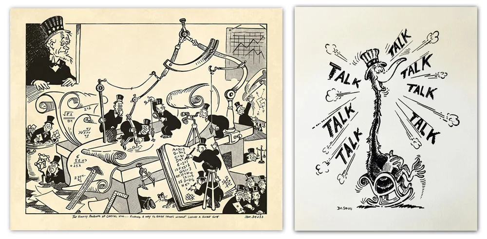The Art of Dr. Seuss Collection political cartoon releases:The Knotty Problem of Capitol Hill...Finding A Way To Raise Taxes Without Losing A Single Vote (left) and Talk Talk Talk (right)