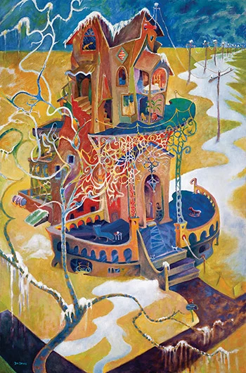 The home at the center of Seuss’s Secret Art painting, That Winter Spring Came Late, bears what seems to be an interesting resemblance to Dr. Seuss’s childhood home, the very place where he began to synthesize his childhood experiences into his now famous settings and creatures. It is fitting then that in this photo his most recognized character, The Cat in the Hat, rests gently against this nostalgic painting.