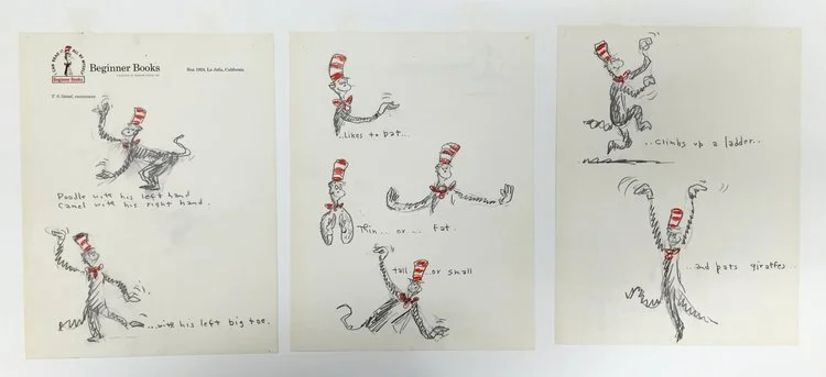 The Yawning Cat debuted in 1967, stretching across two pages of Dr. Seuss’s Cat in the Hat Songbook. In this ambitious project, the Cat and an additional host of characters illustrate a collection of songs written by Ted Geisel (aka Dr. Seuss) that were eventually recorded into an album. The artwork generated for this project, from Ted’s early concept drawings to his final pen and inks, are some of the most engaging of his entire catalog.
