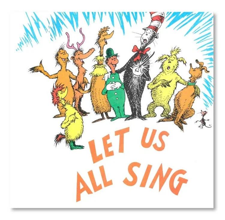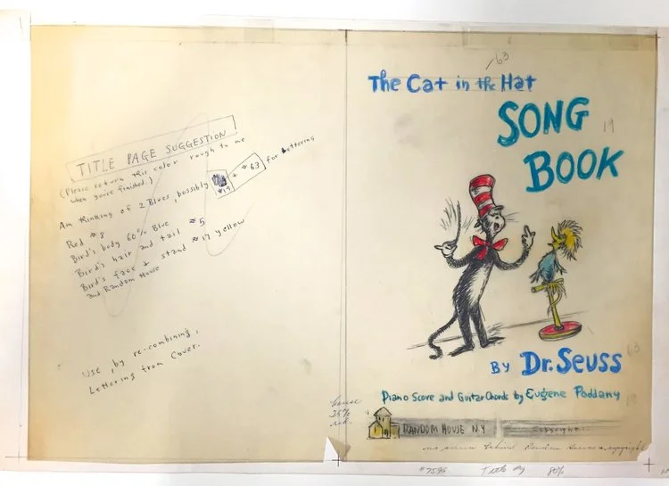 These biographical tidbits seem to converge in The Cat in the Hat Songbook, where reading and writing meet music and unimpeded Seussian fun. Published in 1967, just one year before Ted’s father passed away, it may have been a shout-out to what Ted said was his dad’s “jolly baritone” and the way at holidays he “held a pointer to the lyrics of folk songs he had chalked on a slate.” The inside flyleaf of the book even has the Cat in the Hat holding a pointer; the giveaway words on this page reading — “Let Us All Sing.”